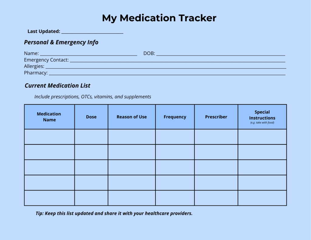 Keep every prescription, OTC, and vitamin organized on one sheet, perfect for clinic visits or caregiver hand-offs.